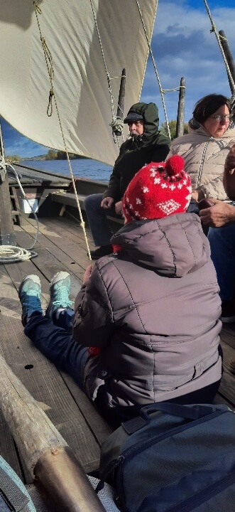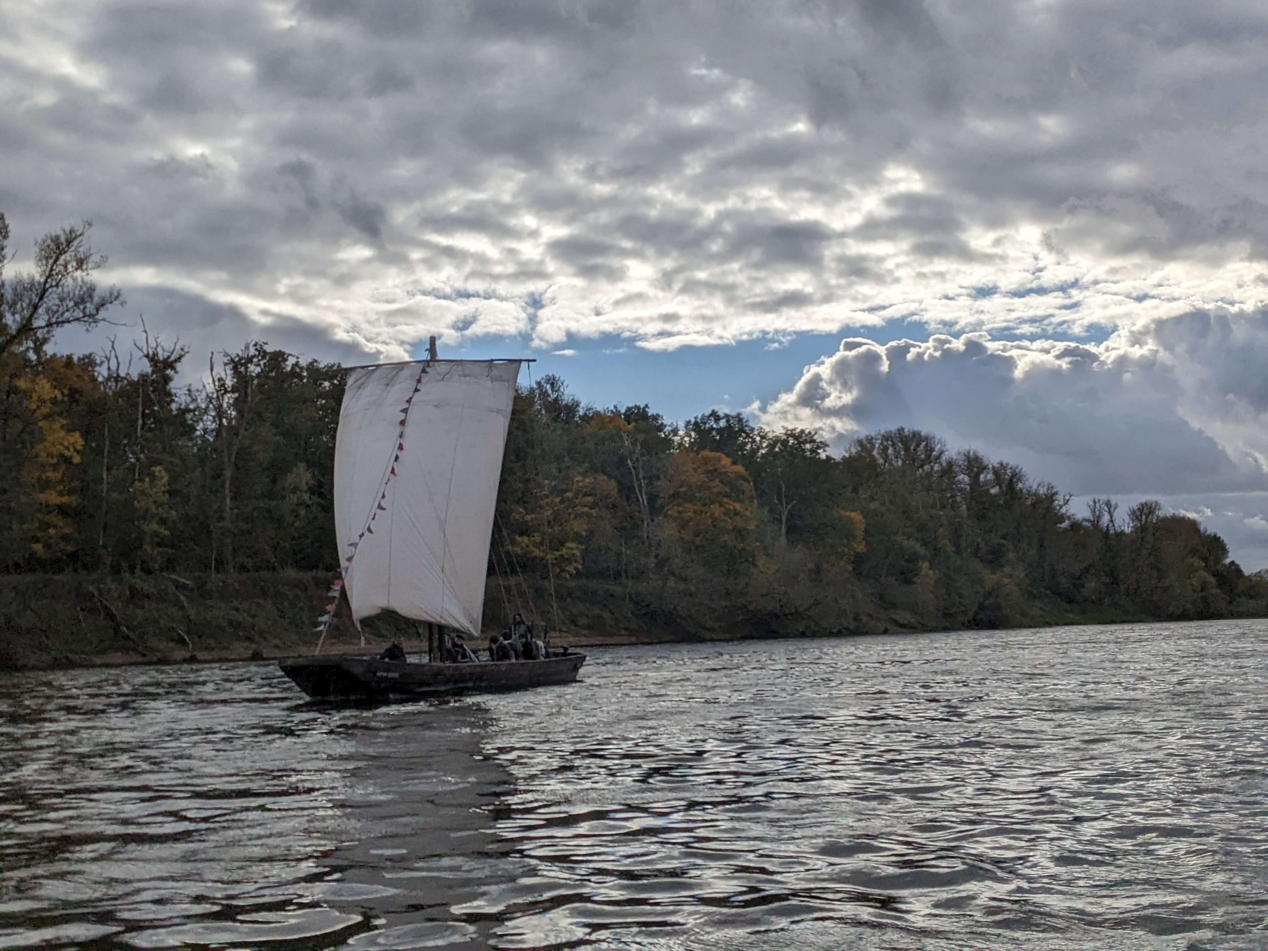 Nous voici répartis sur deux bateaux, pilotés par Johanna et Cédric. A la demande de certains passagers malicieux, Johanna nous dispense les conseils de sécurité. Et vogue la toue sur les eaux paisibles ! Le vent est toujours de la partie et c’est tant mieux, l’aventure n’en aura que plus de charme. L’occasion de hisser la voile s’impose alors pour notre plus grand plaisir mais cela requiert force et adresse. Johanna s’en tire à merveille. Elle me confie la mission de tenir « une ficelle » attachée à la voile. J’obtempère mais sans vraiment savoir quel est le but de cette manœuvre. Quelques moqueurs me disent : « Surtout ne lâche pas la ficelle » ! Je comprendrai plus tard que ce cordage qu’on appelle « gueurde » dans le vocabulaire de la marine de Loire sert à relever le milieu de la voile afin de permettre au pilote de voir plus facilement l’avant du bateau. Finalement, c’est bien utile !